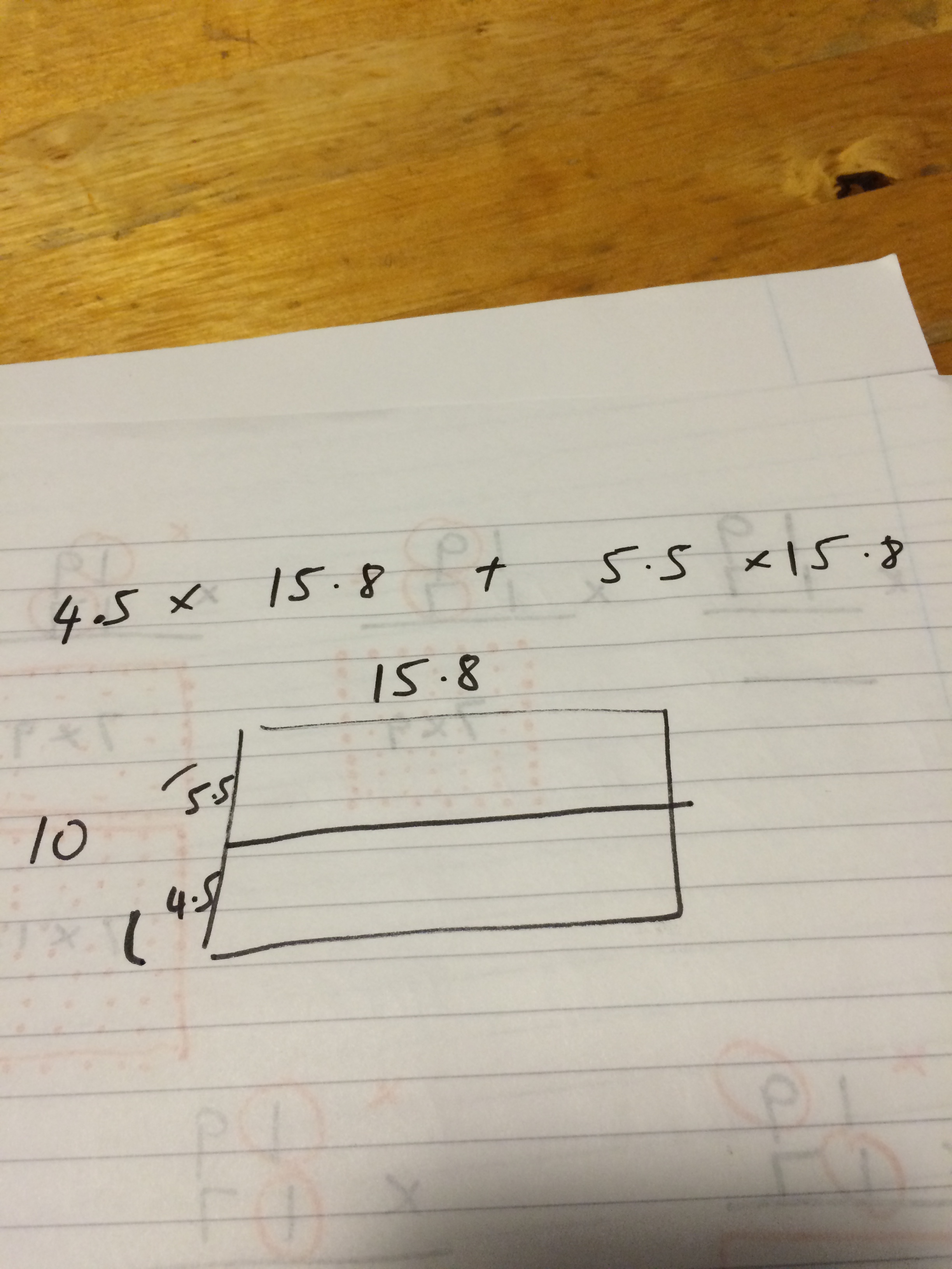 He got the bit where you divide 45 by ten and adjust by multiplying 1.58 by 10, but didn’t agree that 4.5x 15.8 + 5.5x 15.8 was the same as 10×15.8. Until I drew this.image