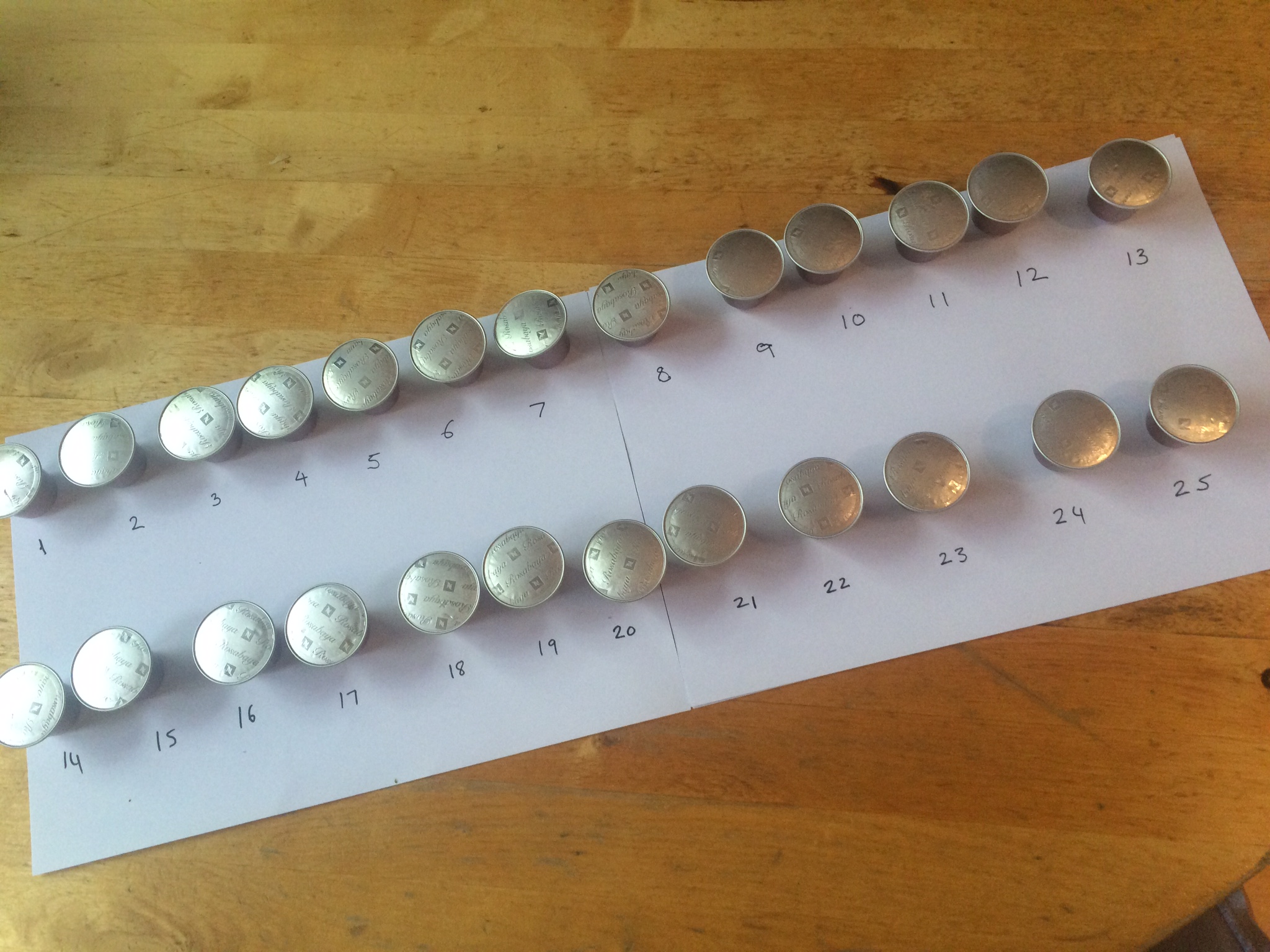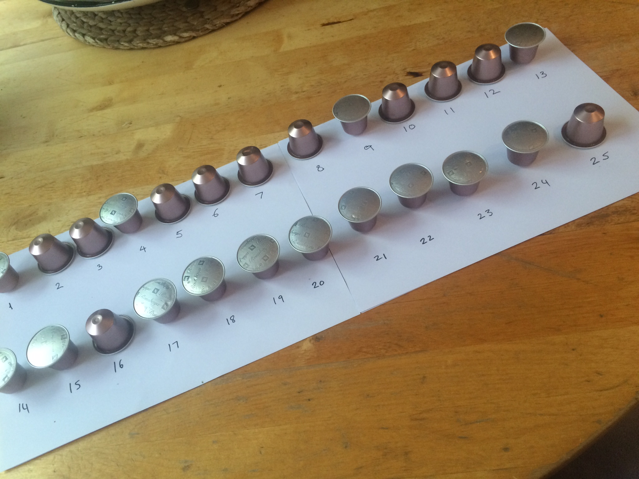 In my previous post (silly carpets and the light switchers) I mentioned an interesting problem and promised to post the solution – I’m sure it was easy enough the work out especially since the title also mentioned prime and square numbers. I’ve never actually done it practically before. But for you, dear reader, I’ll go that extra mile. Really glad I did because I’ve just appreciated that that this is a really great problem for upper ks2 ( possible ks3. – what do I know?) and a fun way to rehearse those tables yet again. I wanted to video it but lack of something to fix my phone/ iPad into eluded me. Too many shots of me in my dressing gown (hey it’s the weekend, you don’t expect me to actually get dressed?) So just what is probably one of the most boring sets of photos ever- but what was strangely satisfying to do in practice. I needed an object I could turn over to signify the light being on or off.  Having no plastic cups I resorted to nespresso coffee capsules which makes this the most middle class poncy maths investigation ever….in class maybe use those mini ketchup cups you get at McDonalds or biscuits like Jaffa cakes which have very different sides and which we now all know are zero rated for vat, thanks to MP Stella Creasy.